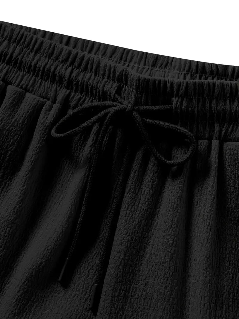 Introducing our Men’s 2-Piece Summer Suit, featuring a small checkered texture that adds a touch of sophistication to your casual wardrobe. This set includes a short-sleeve shirt with a suit collar and matching shorts, both designed in a solid color for versatile styling.